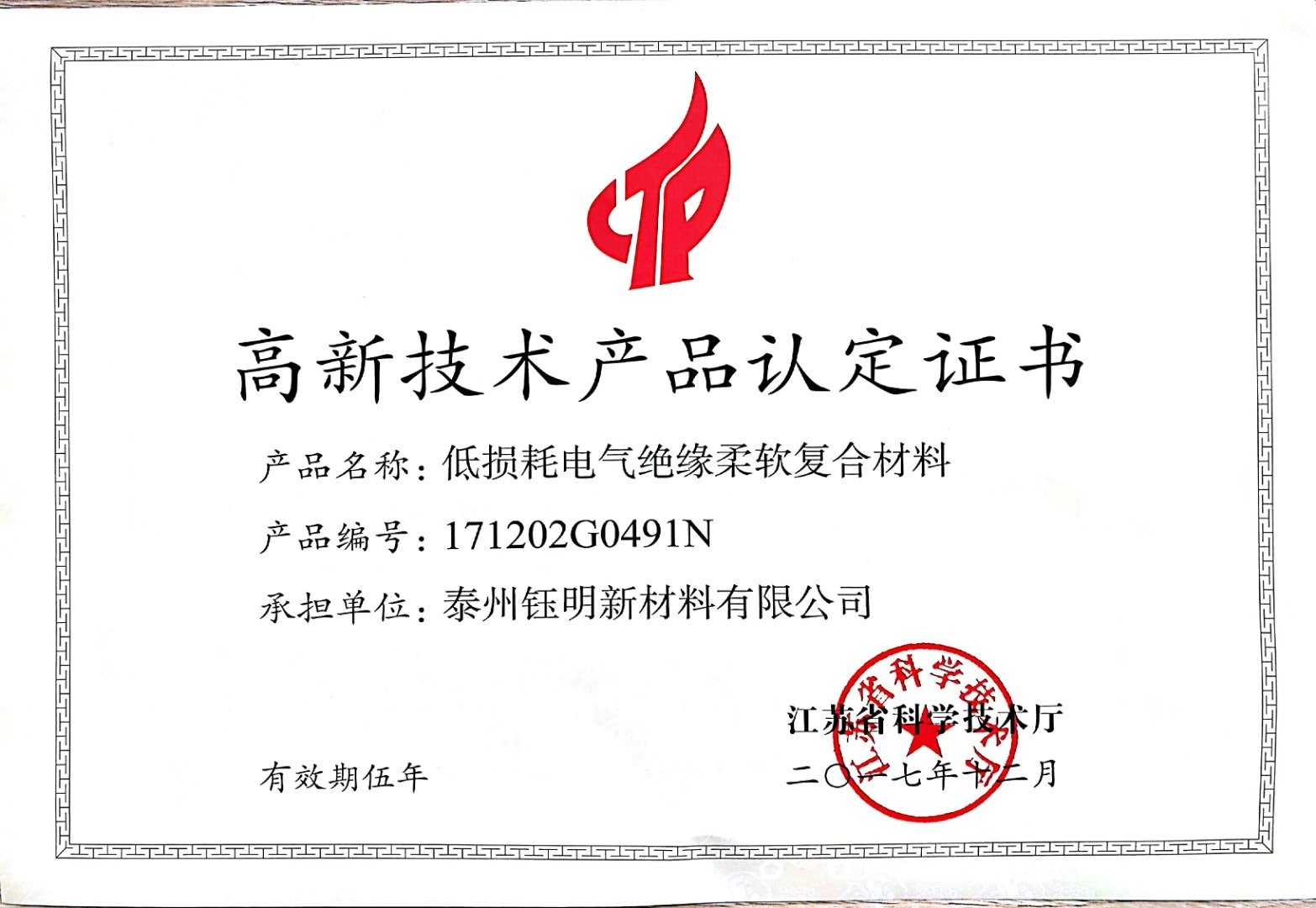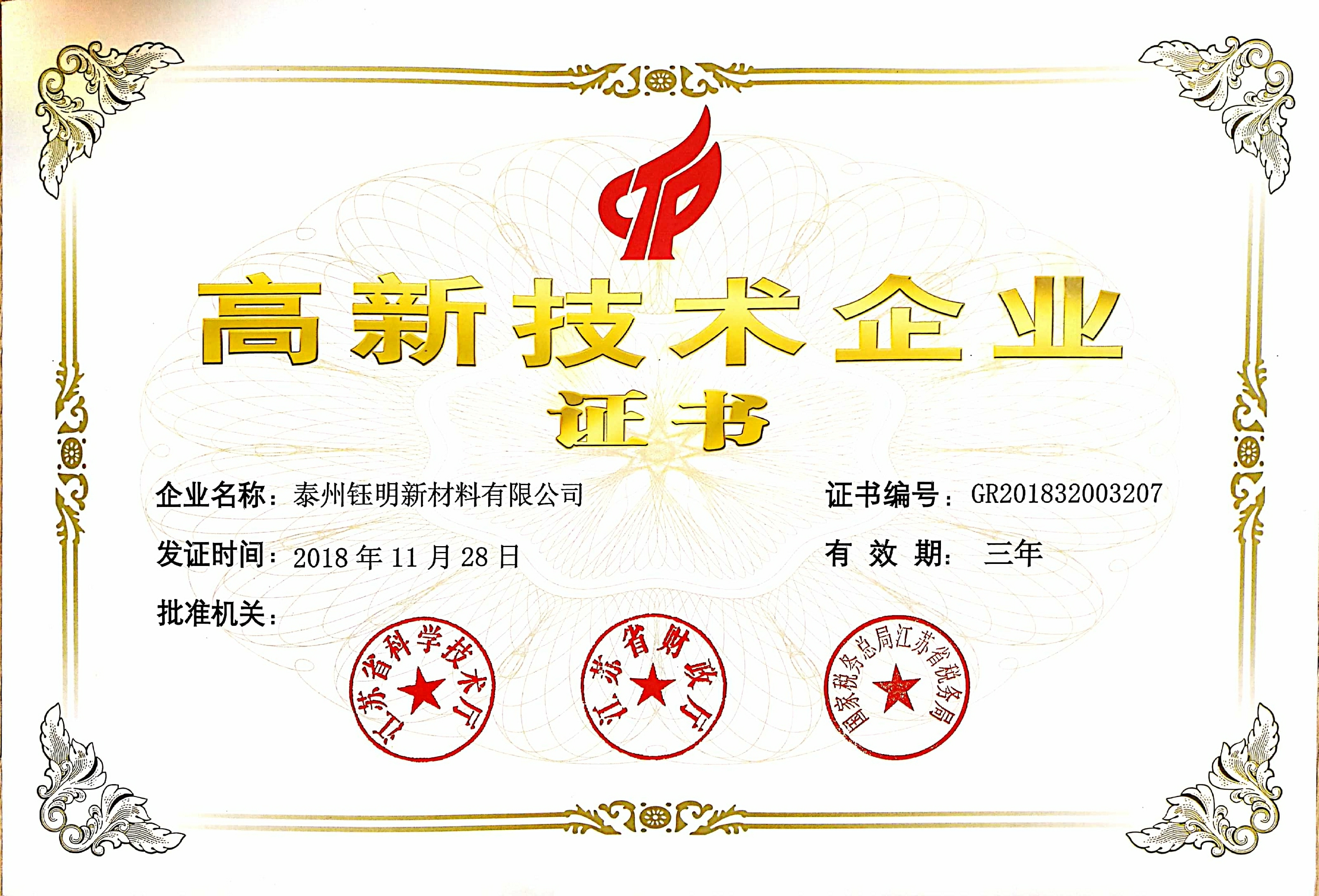 2018年11月28日泰州钰明新材料有限公司荣获由江苏省科学技术厅、江苏省财政厅、国家税务总局江苏省税务局等多家单位批准颁发的“高新技术企业证书”(编号:GR201832003207)。